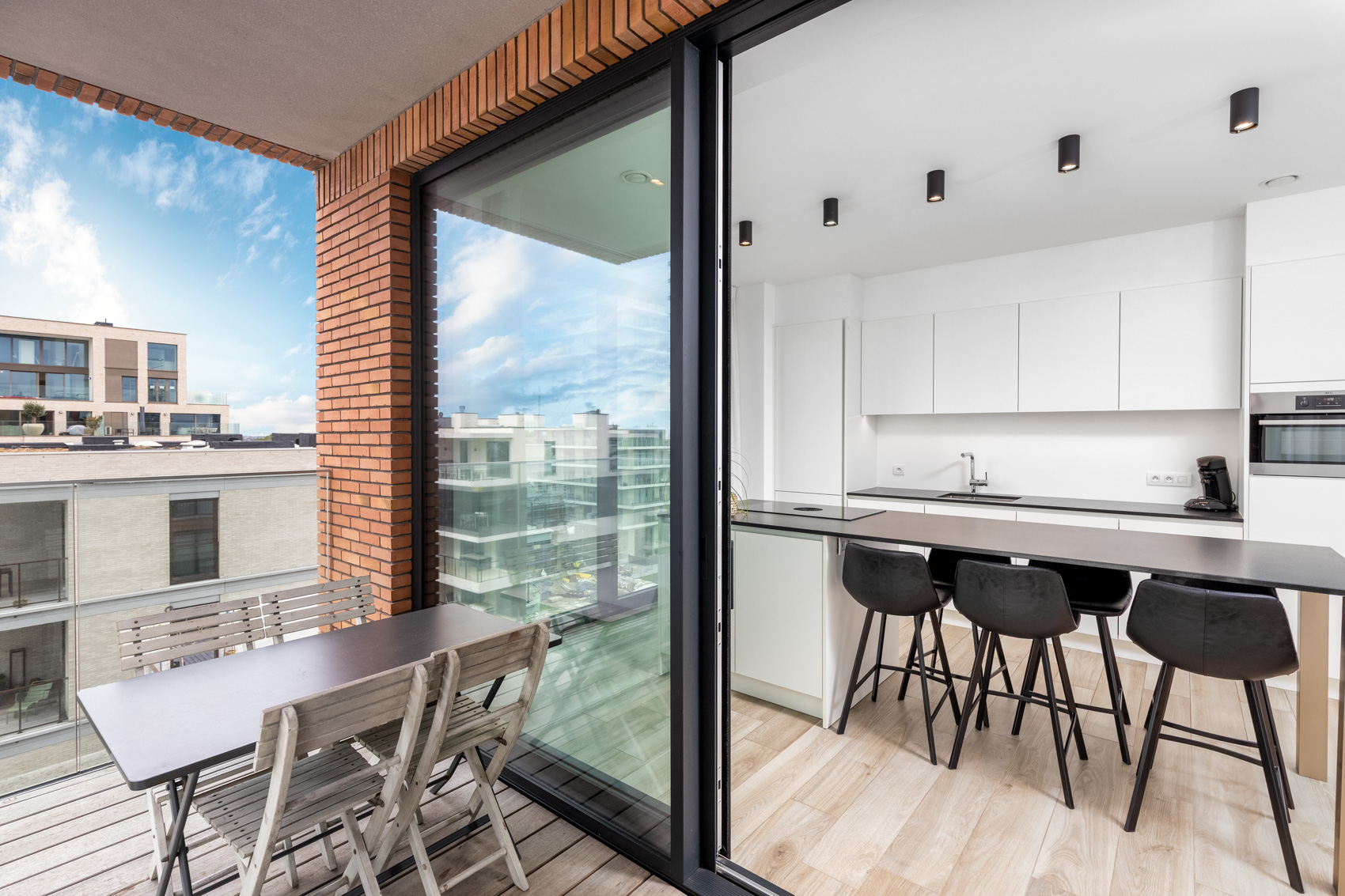 Vanuit de keuken stap je naar het overdekte terras van 9 m², ideaal georiënteerd op het noordwesten. Hier kan je volop genieten van de avondzon, het zijdelings zeezicht én een prachtig uitzicht op het park.