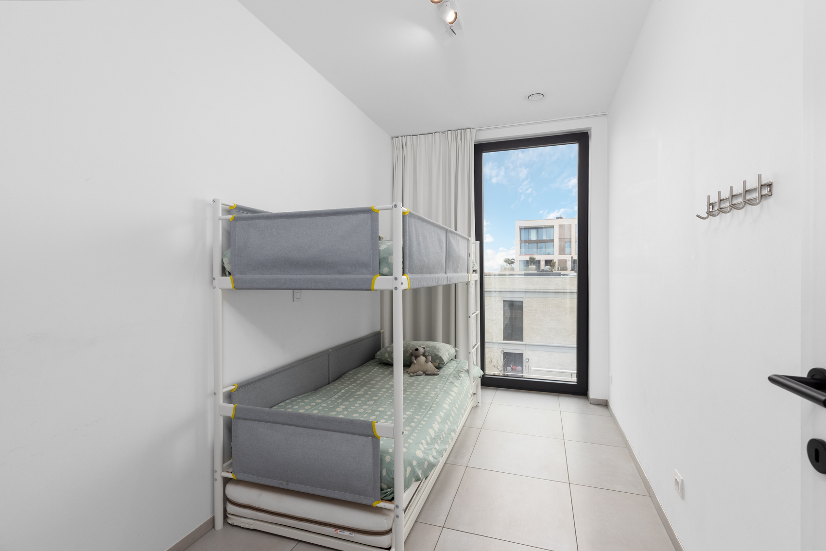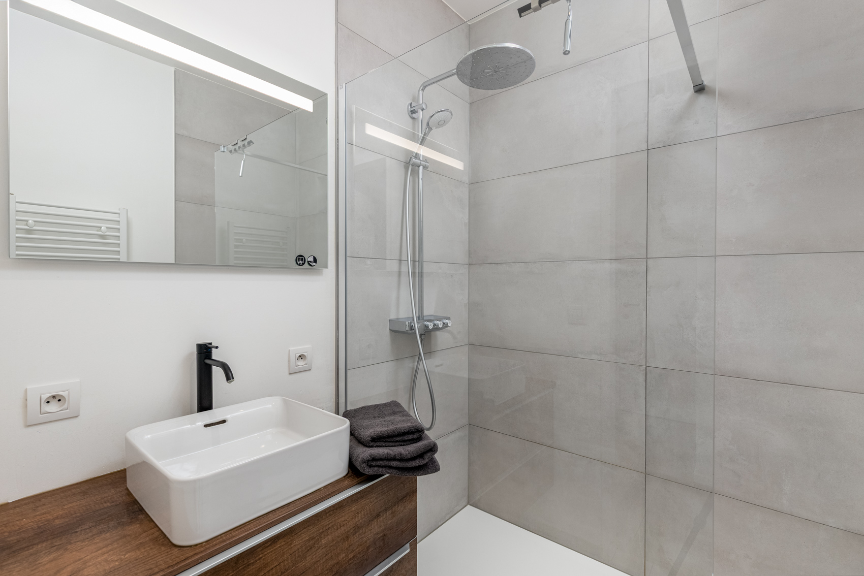 Het appartement beschikt over twee slaapkamers en een badkamer met inloopdouche, modern lavabomeubel en handdoekdroger. Daarnaast is er een aparte berging met aansluiting voor wasmachine en droogkast.