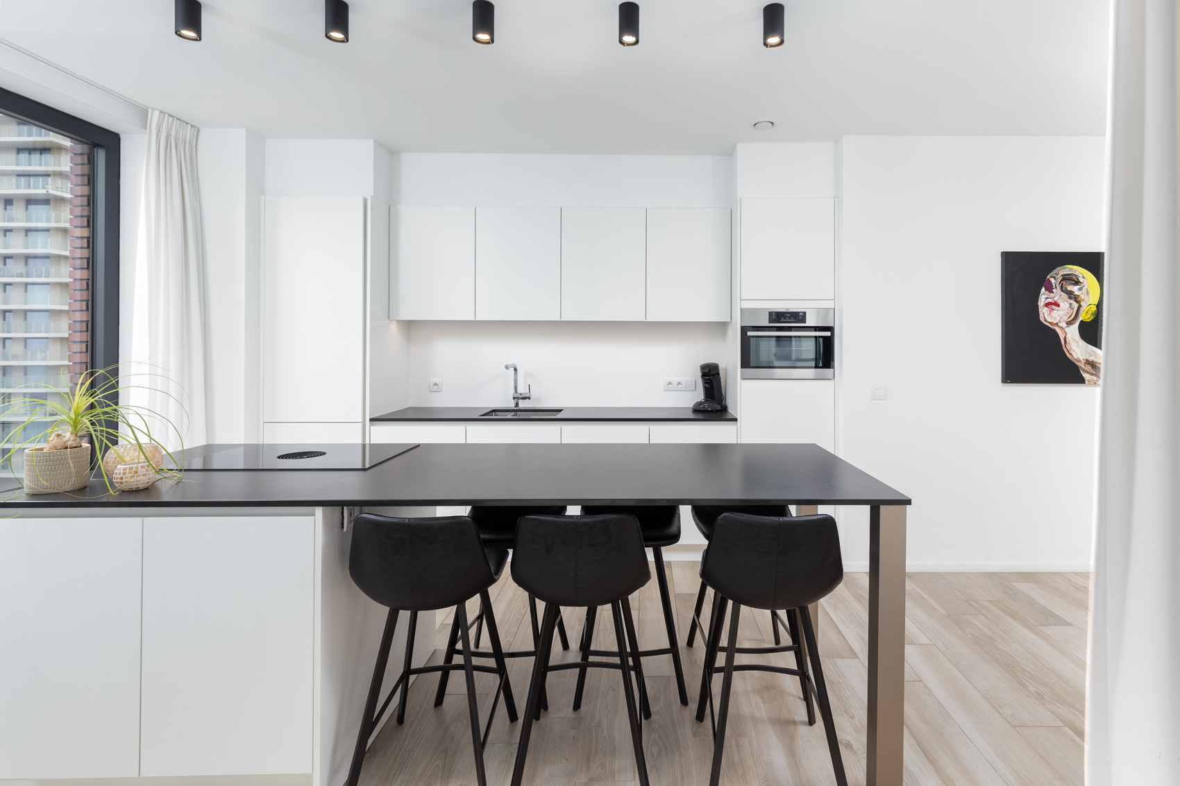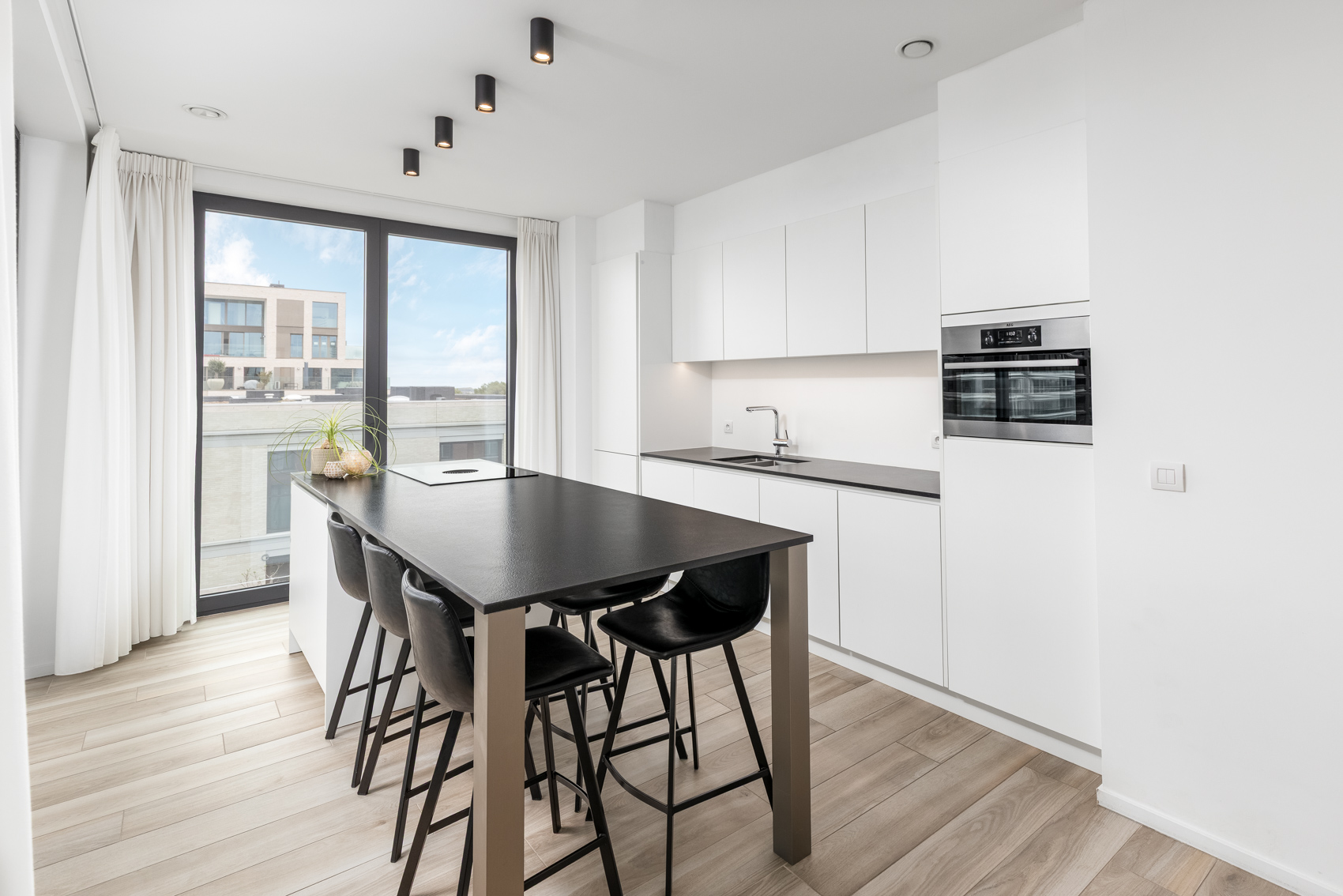 De moderne keuken is een echte eyecatcher: een granieten werkblad, een centraal kookeiland met inductiekookplaat van Bora en geïntegreerde dampkap, en een volledig uitgeruste keukenwand met spoelbak en volgende toestellen van AEG: vaatwasser, combi-microgolfoven, koelkast en afzonderlijke diepvriezer.