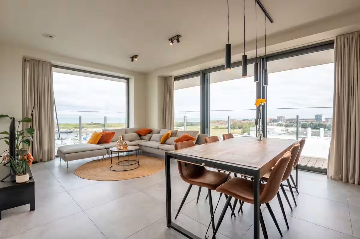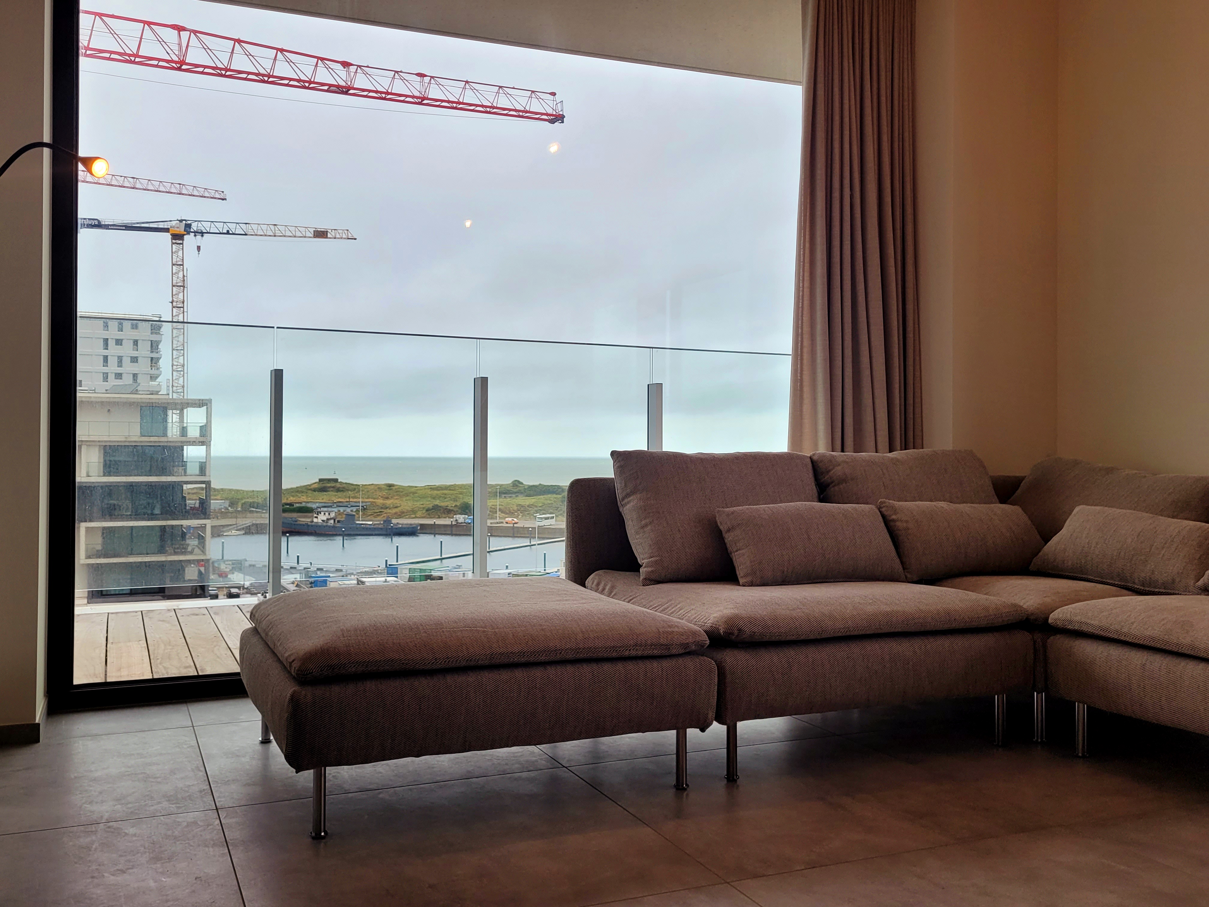 Inkomhal met apart toilet, aparte berging, via de glazen deur komt u binnen in de lichtrijke L-vormige leefruimte van 35m². Vanuit de living geniet je van het prachtig zeezicht. Rondom het appartement is er een ruim terras van 44m².