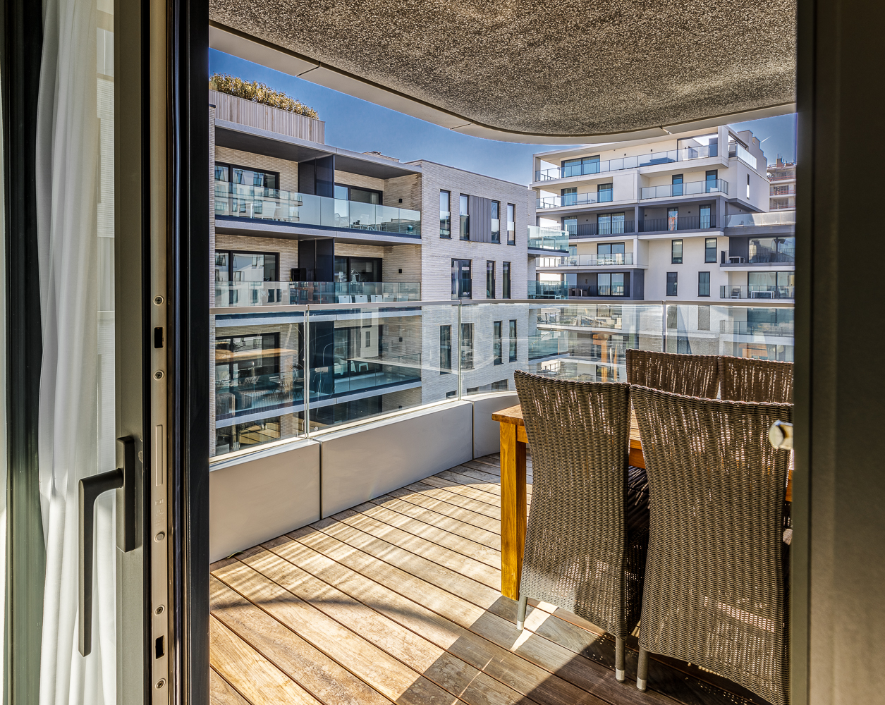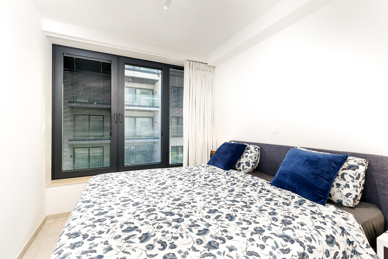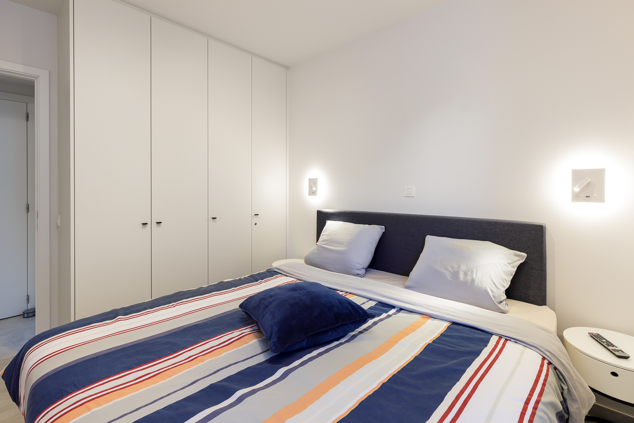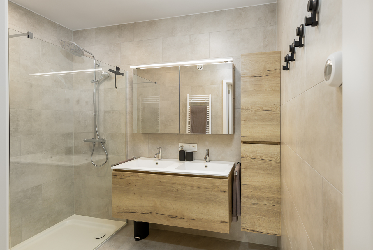 Nachthal met 2 slaapkamers elk voorzien van een tweepersoonsbed en ingemaakte kleerkast. Badkamer met inloop regendouche en dubbel lavabomeubel met hangkast. Aparte berging voorzien van WM + DK van AEG.