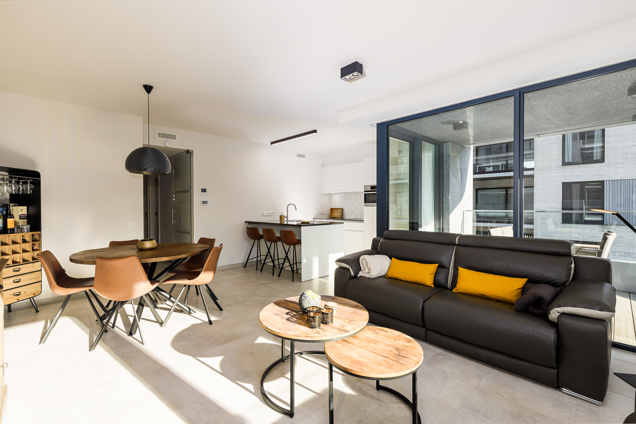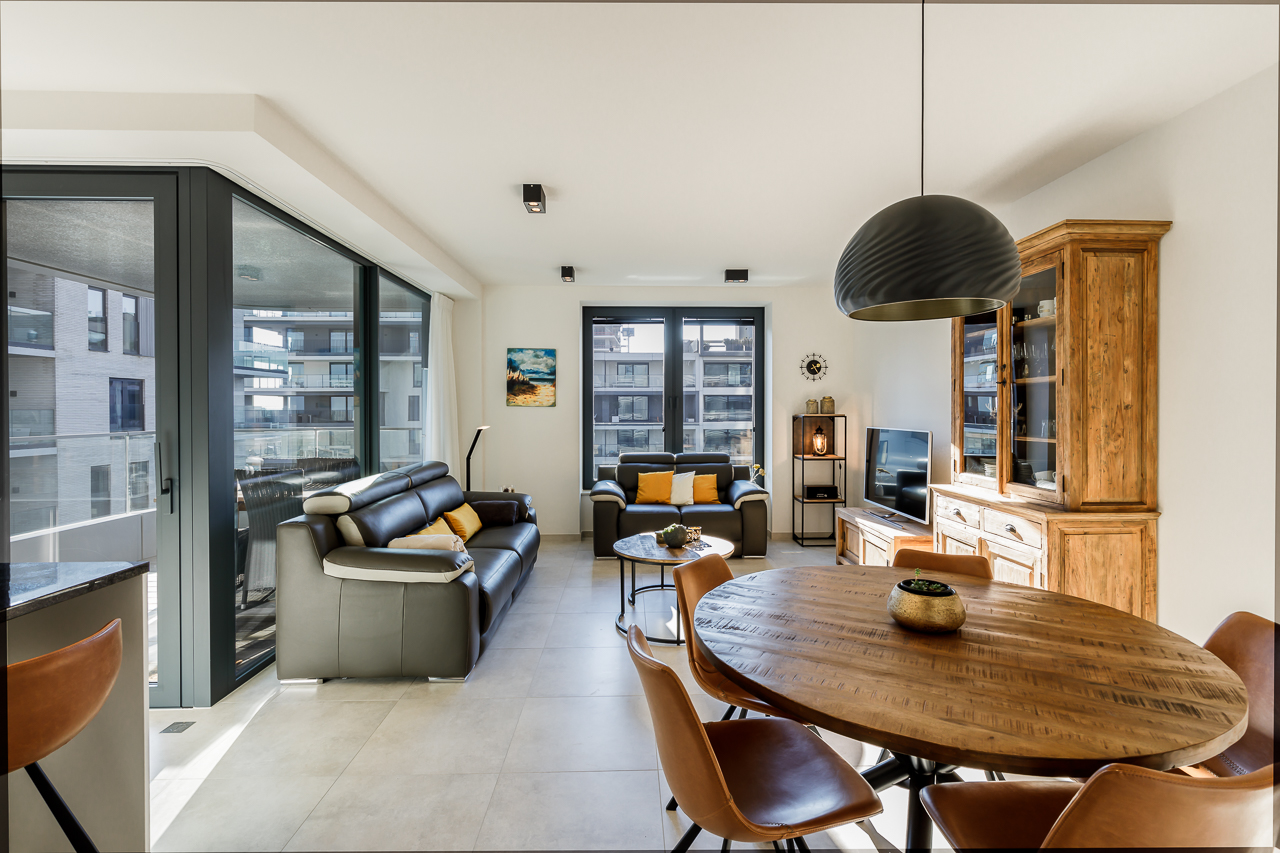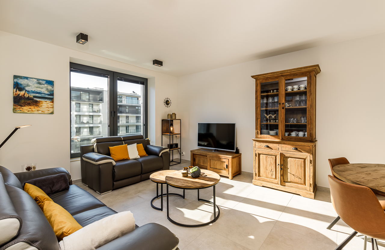 Knus en gezellig hoekappartement met 2 slaapkamers. Inkomhal met ingemaakte vestiairekast, apart toilet, glazen deur naar living met zithoek, eettafel en keuken. Aan de living en de keuken er een zuidgericht terras. Het appartement wordt volledig ingericht verhuurd.