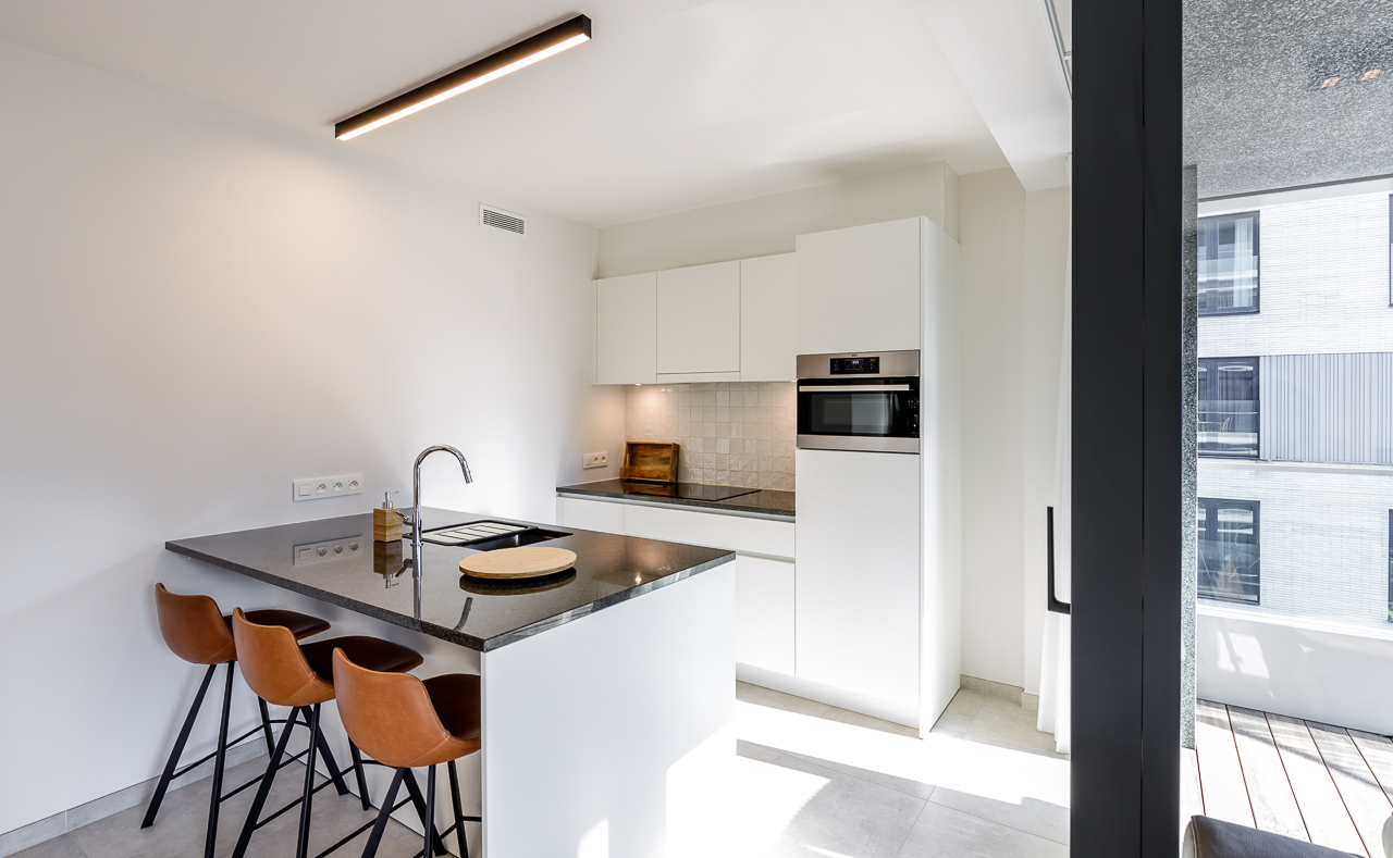 De keuken is volledig ingericht: vaatwasser, inductie kookplaat, Novy dampkap, Combi-microgolfoven en oven. Koelkast met diepvriesvak. Alle toestellen zijn AEG.