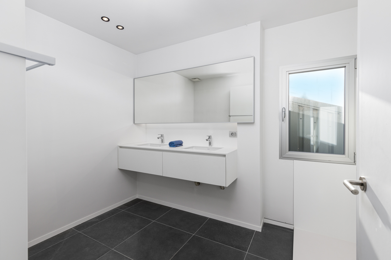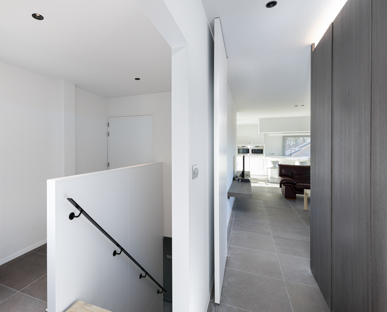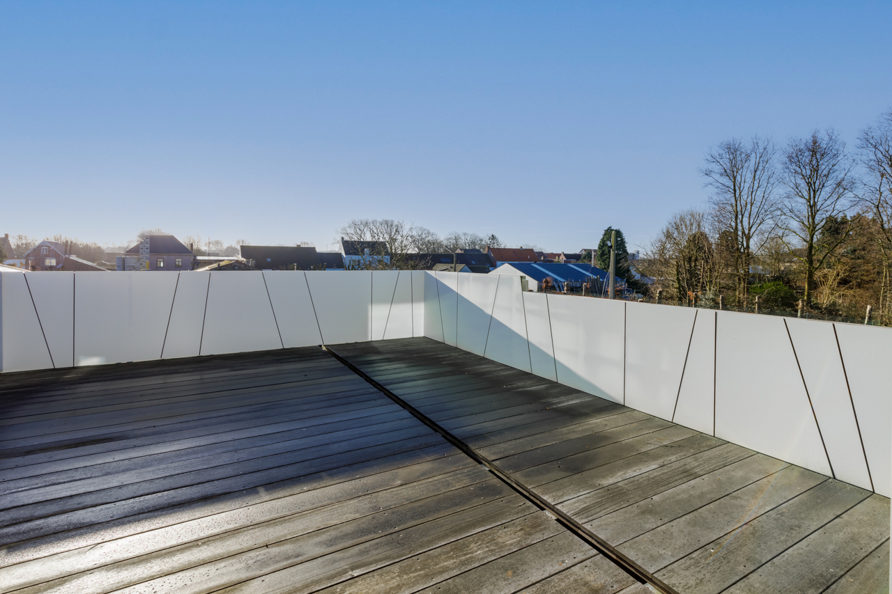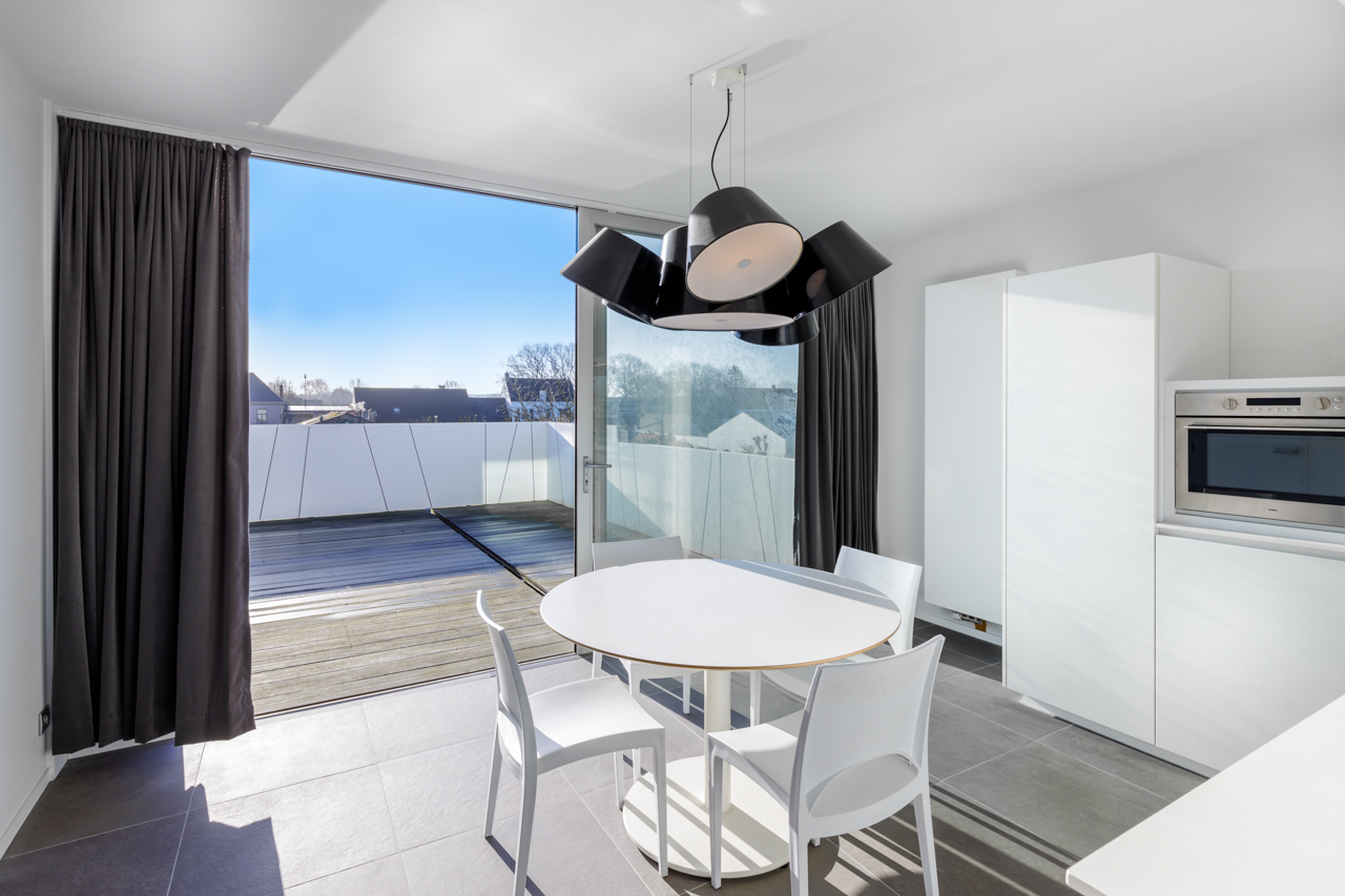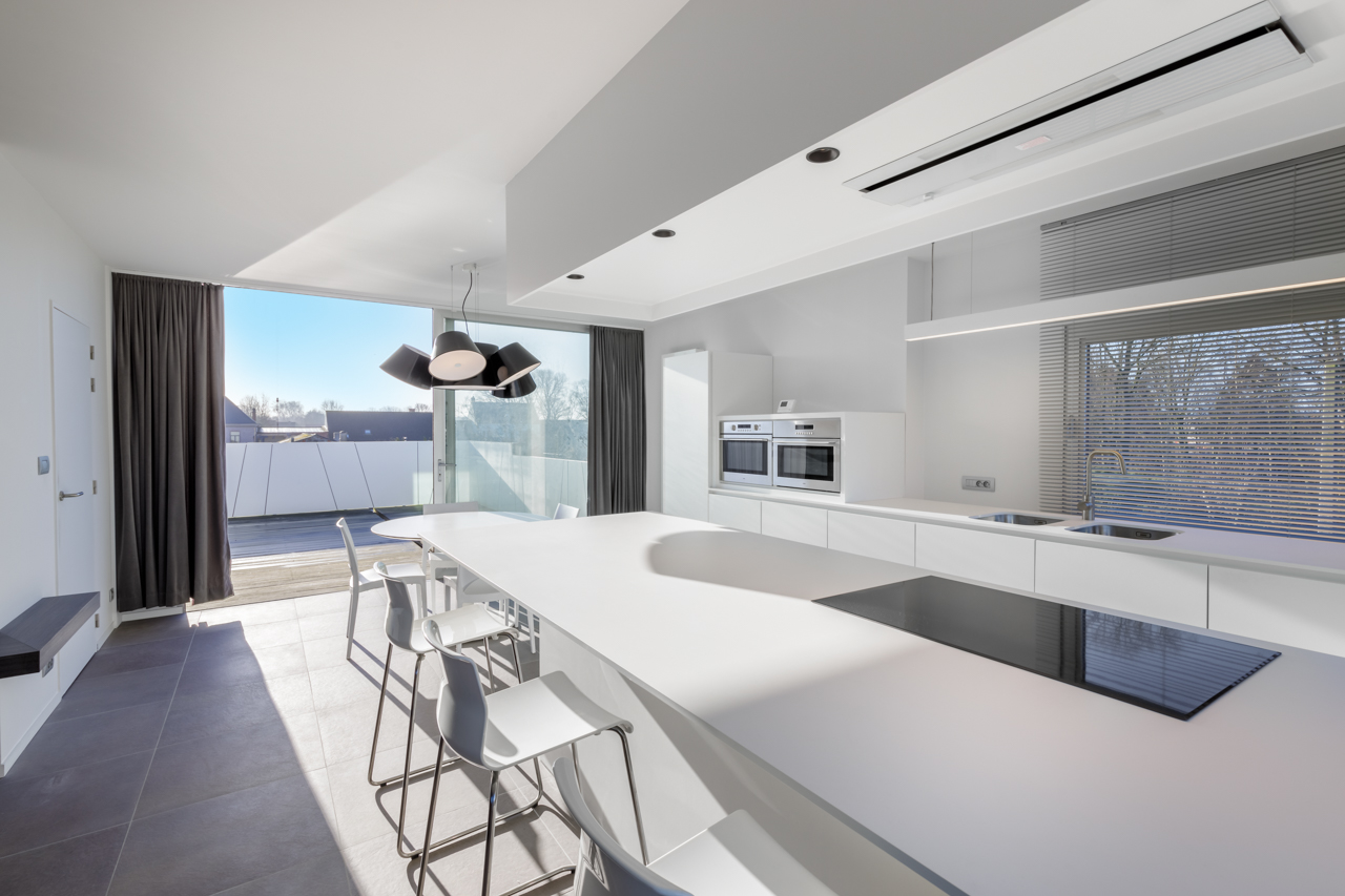 Ruime inkomhal met gastentoilet, dubbele garage met fietsenstalling. Trap naar tussenverdieping met bureelruimte. Trap naar eerste verdieping met ingerichte living en strakke moderne keuken + eethoek. Volledig ingerichte keuken met inductiekookplaat, vaatwasser, bakoven en microgolfoven. Vanuit de eethoek kan u naar het dakterras 40m² en de bijkeuken/wasplaats.