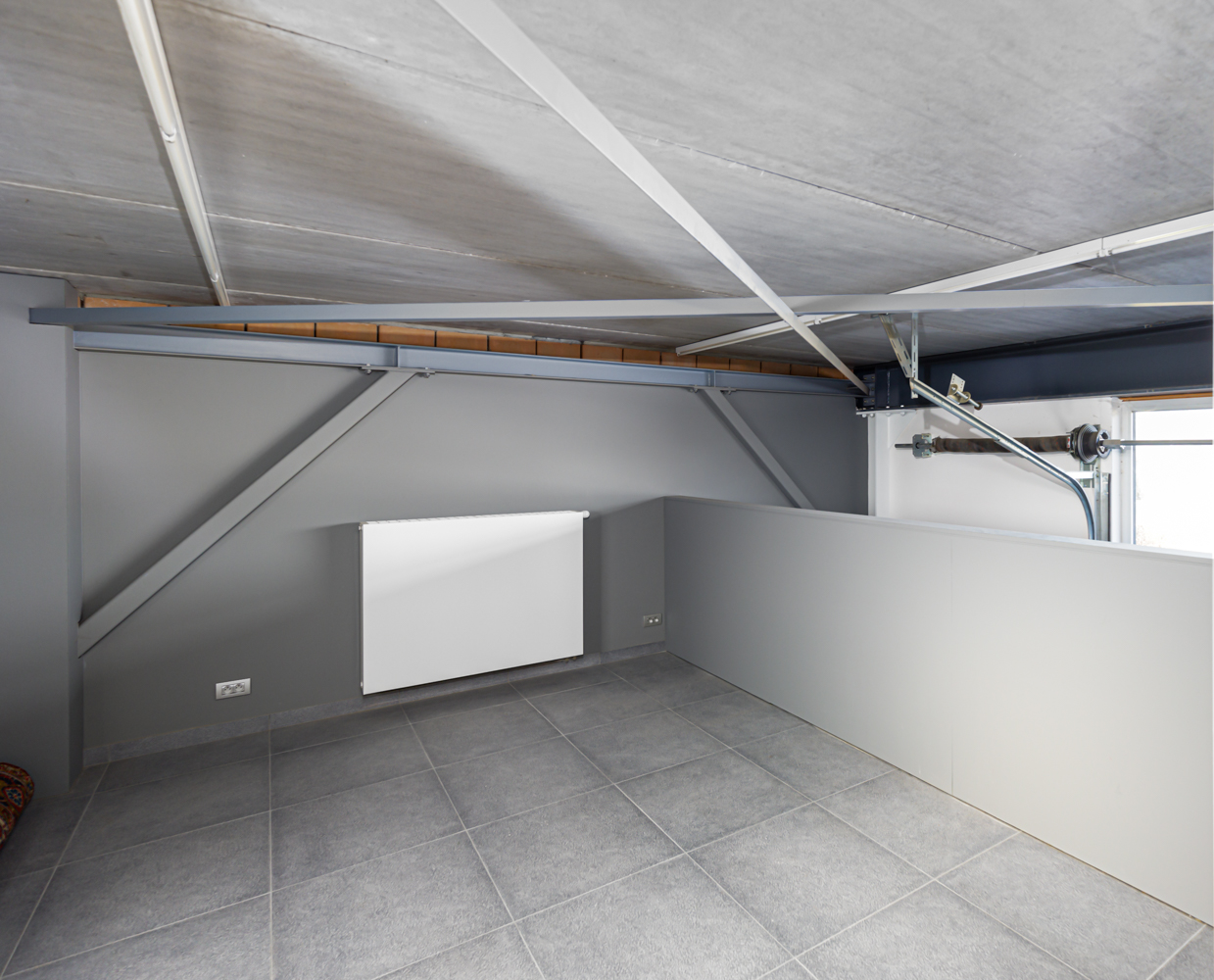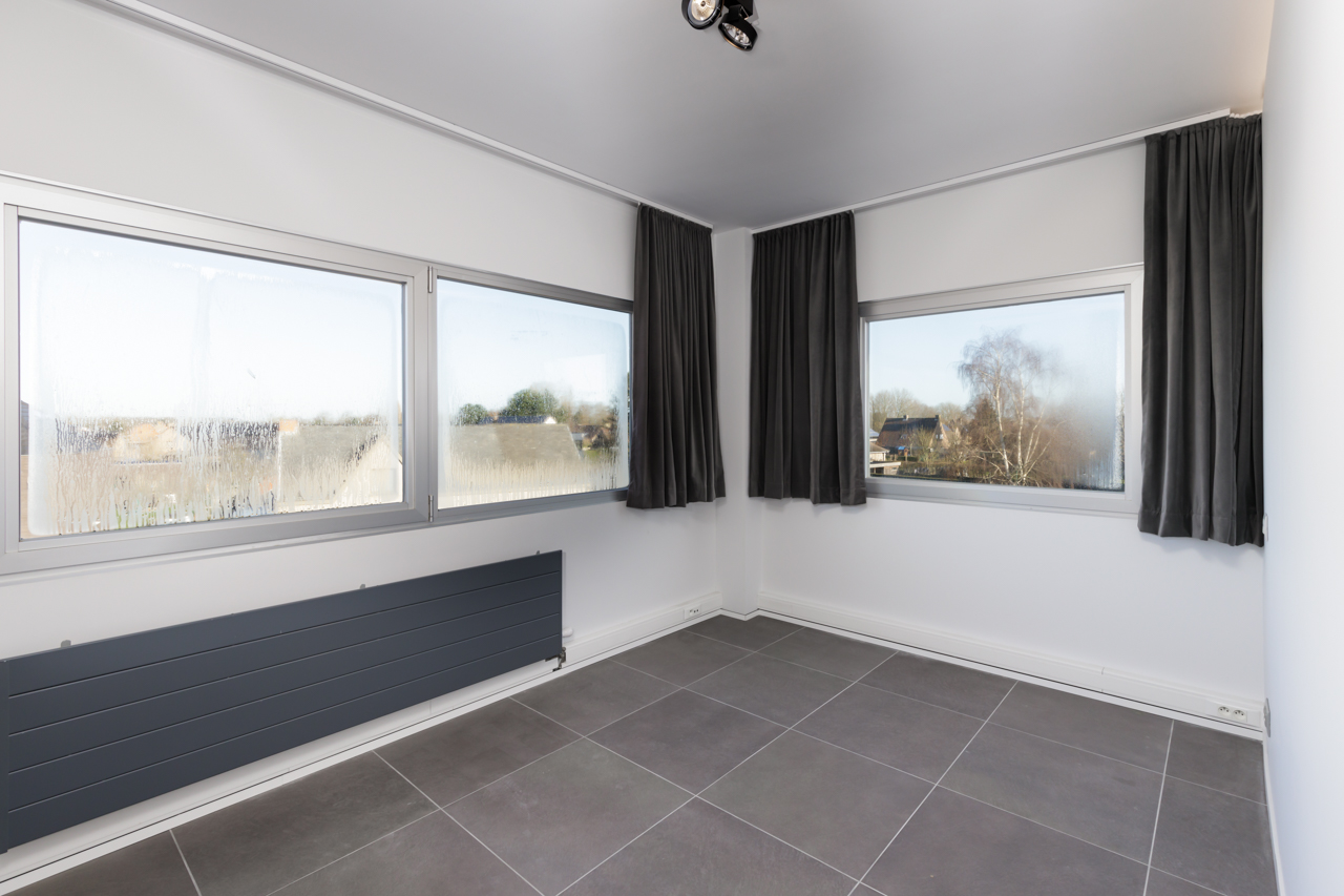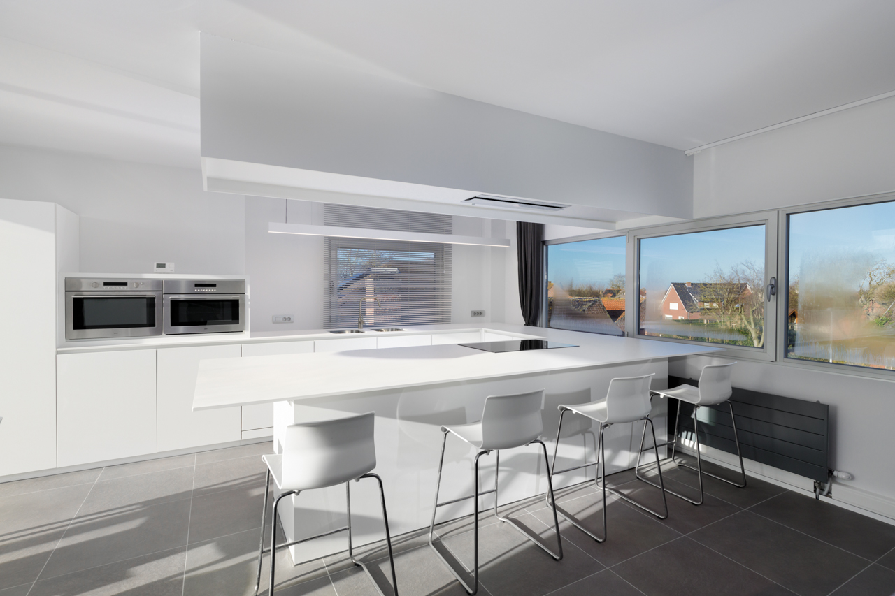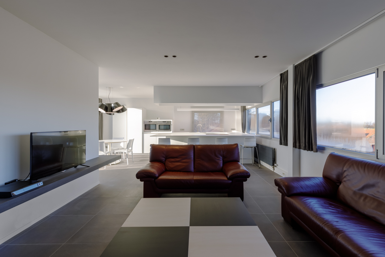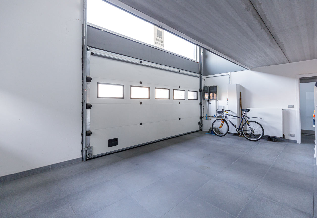 Ruime inkomhal met gastentoilet, dubbele garage met fietsenstalling. Trap naar tussenverdieping met bureelruimte. Trap naar eerste verdieping met ingerichte living en strakke moderne keuken + eethoek. Volledig ingerichte keuken met inductiekookplaat, vaatwasser, bakoven en microgolfoven. Vanuit de eethoek kan u naar het dakterras 40m² en de bijkeuken/wasplaats.