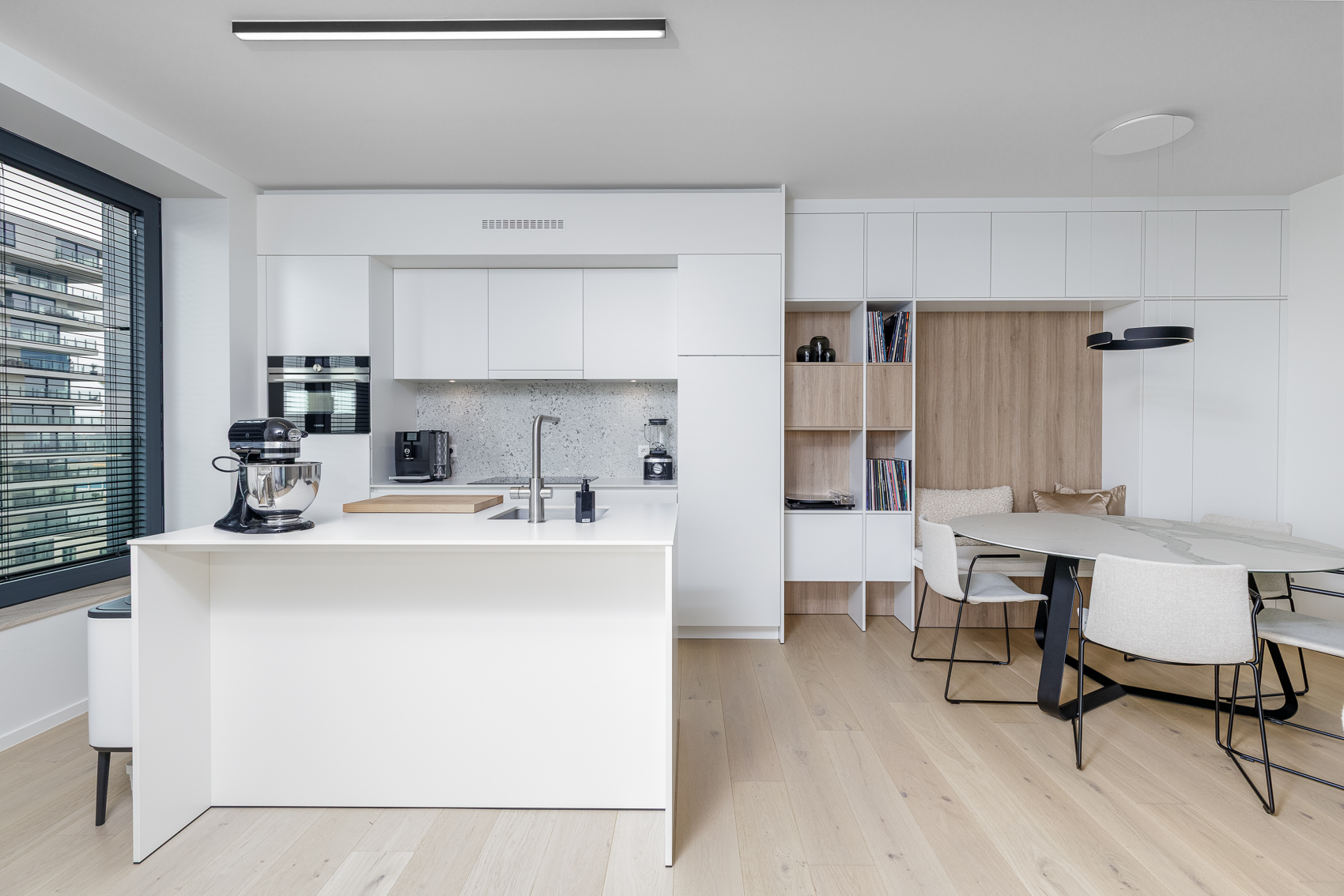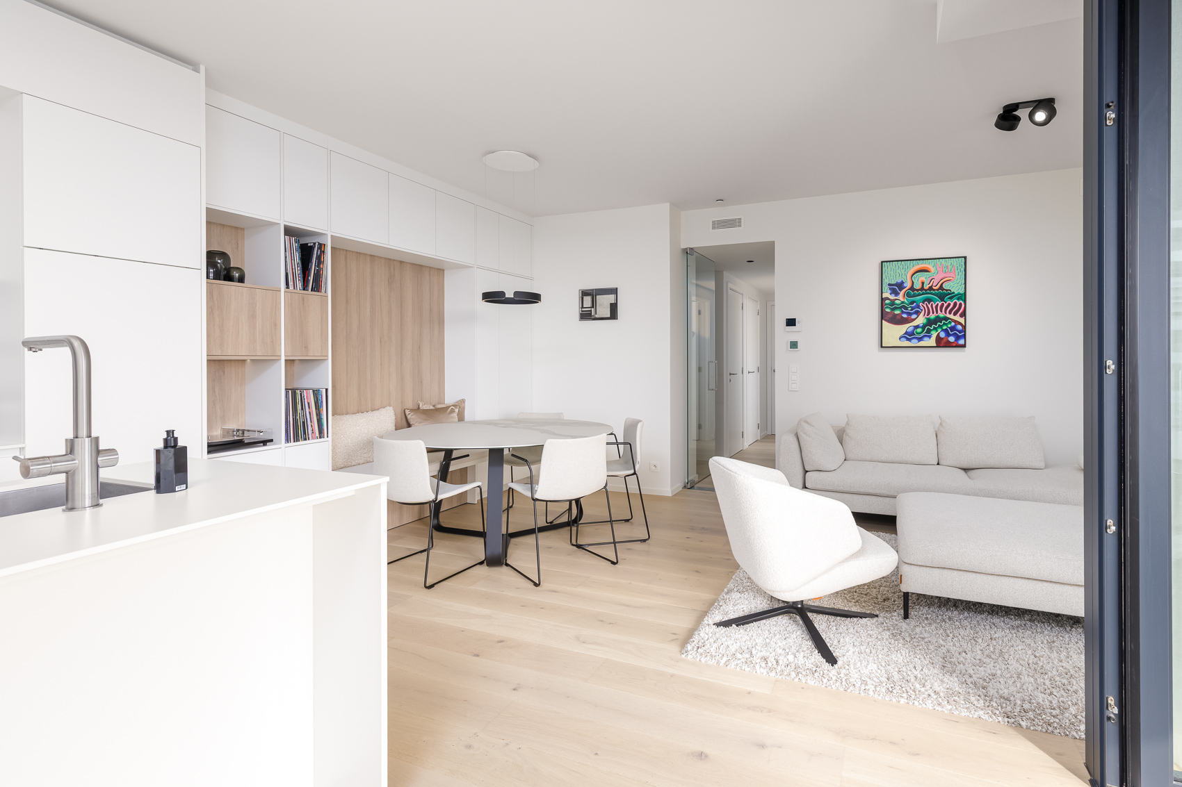 - Lichtrijke leefruimte met maatwerk kastenwand en indirecte verlichting. Een knusse ingewerkte zitbank bij de eethoek en een stijlvol TV-meubel met lades en boekenwand creëren een gezellige zithoek.