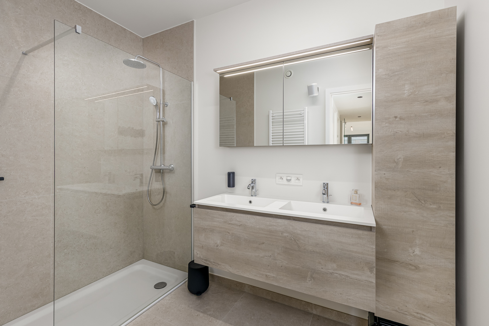 - Badkamer met dubbel lavabomeubel, hangkast en ruime inloopdouche.