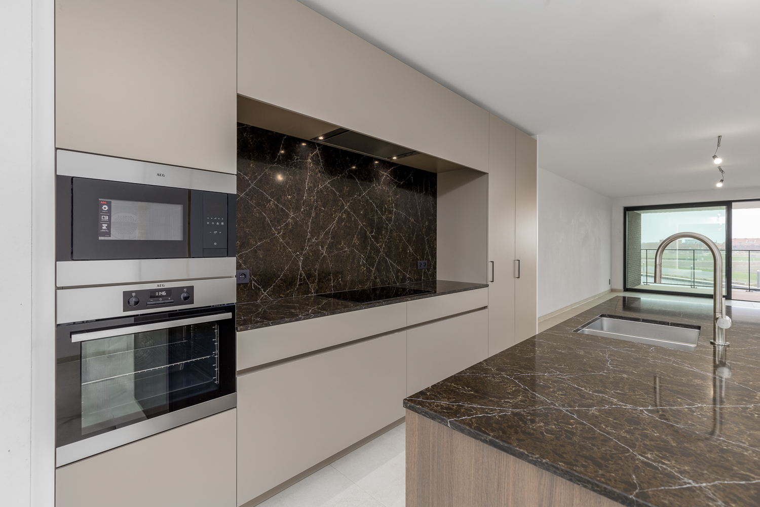 Volledig ingerichte keuken met marmer werktablet en achterwand: vaatwasser, bakoven, microgolfoven en inductie kookplaat, diepvriezer met lades, alle toestellen zijn van AEG. Behalve de hoge koelkast en de wijnkoelkast zijn van Miele.