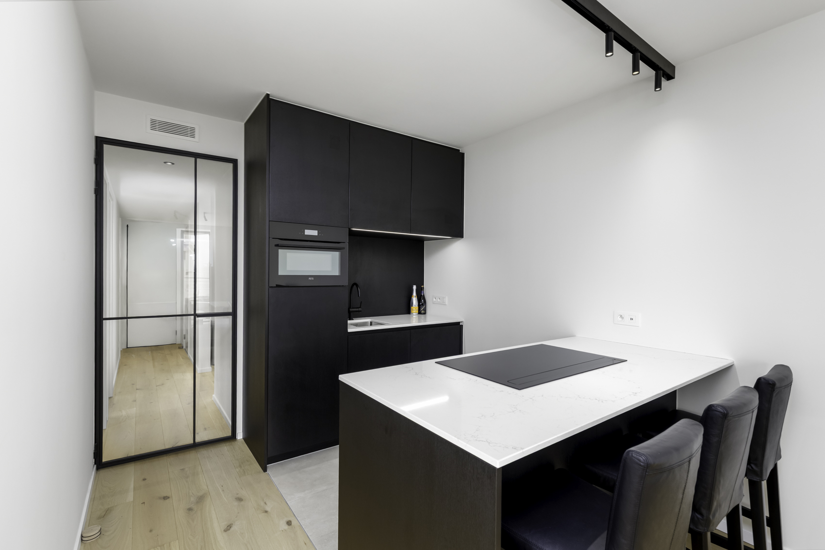 De moderne keuken is een echte eyecatcher: voorzien van een composiet werkblad en een stijlvol kookeiland met inductiekookplaat en geïntegreerde dampkap van Novy. Slim ontworpen kasten en lades zorgen voor voldoende opbergruimte voor al uw keukengerei en apparaten.