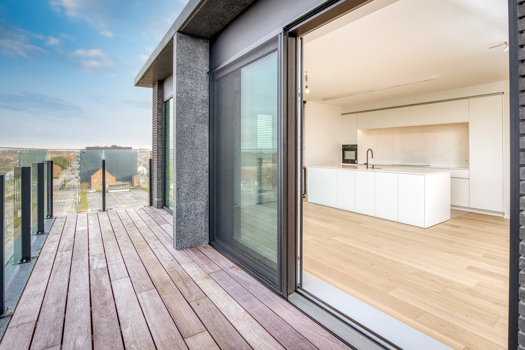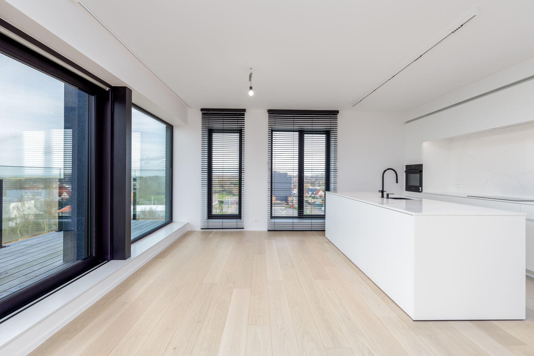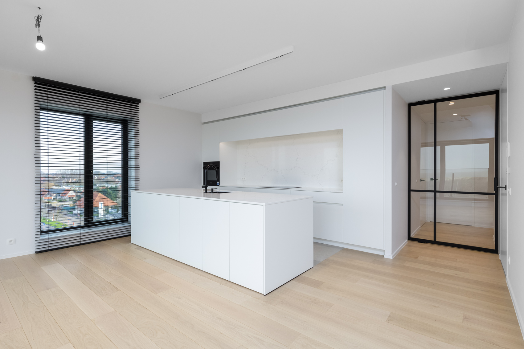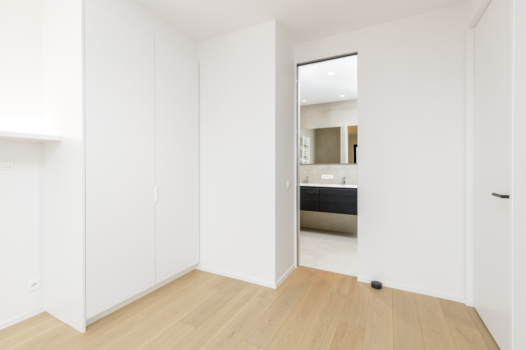 Het volledige appartement is voorzien van: parket, kamerhoge blokkaderdeuren, vloerverwarming, verlichting, gordijnen en schilderwerk. Een geïntegreerde vliegen hor aan het schuifraam,
