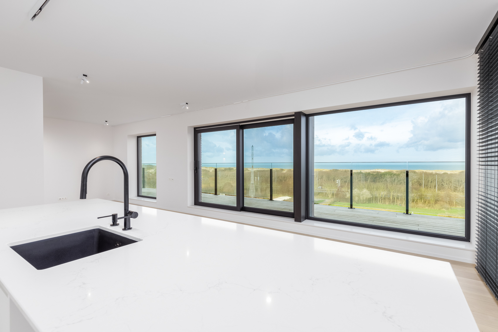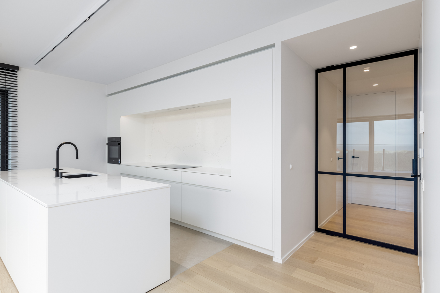 De strakke witte keuken met licht generfde composiet tablet, zal elke hobbykok wel kunnen bekoren. Enkele zwarte accenten: de spoelbak met keukenkraan, de inductie kookplaat en de combimicrogolfoven zorgen voor een moderne look. Ruime koelkast met vriesvak, vaatwasser en Novy dampkap.