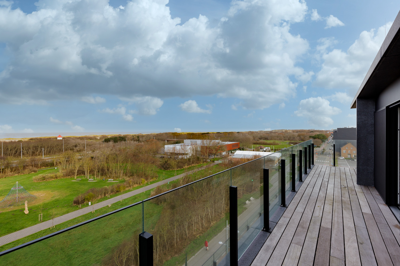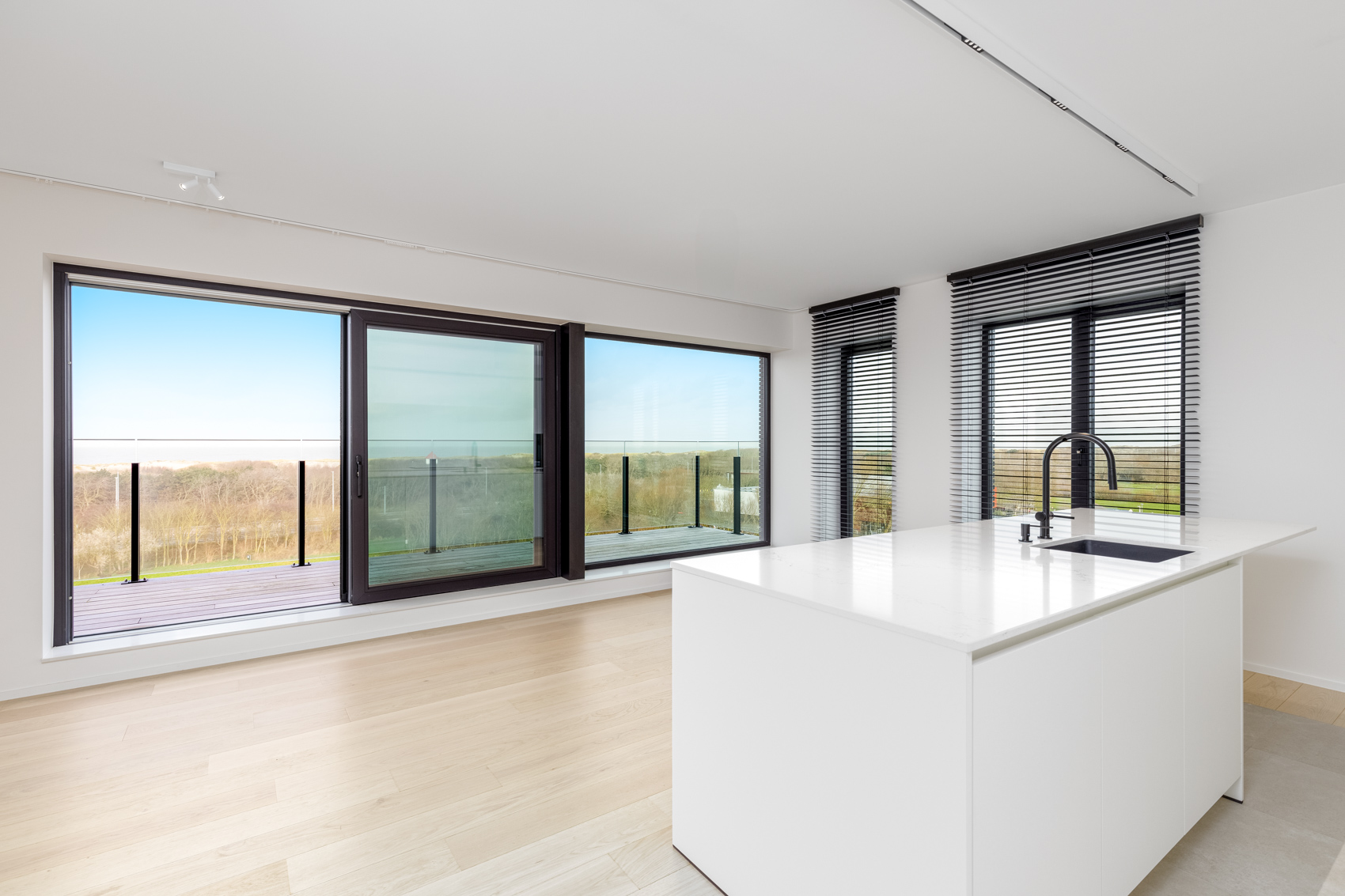 De leefruimte is 9M63 breed en voorzien van 4 ramen, hierdoor heeft u panoramische zichten aan alle kanten. De raampartijen zijn 2M70 hoog waardoor u maximale lichtinval heeft. Een dakterras van 19m² aan de leefruimte, waar u kan genieten van de avondzon. Op het terras is er een waterkraantje voorzien.