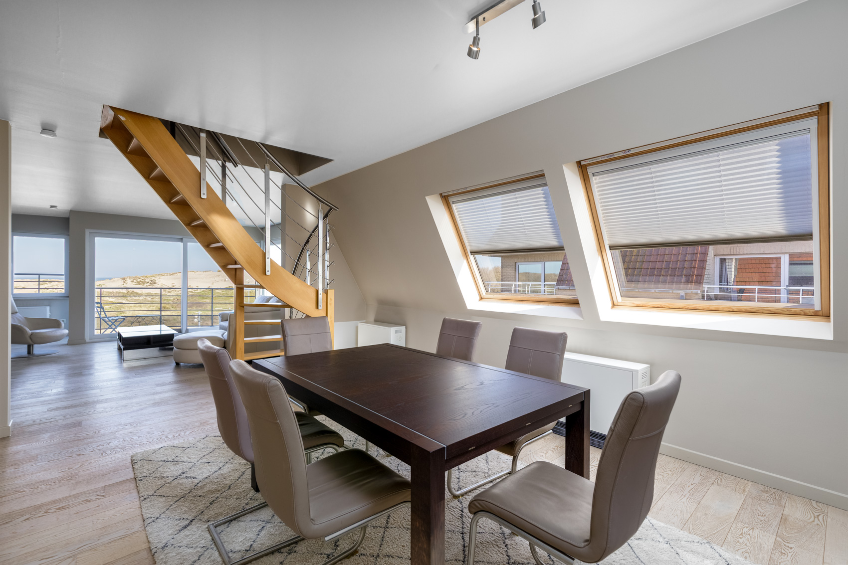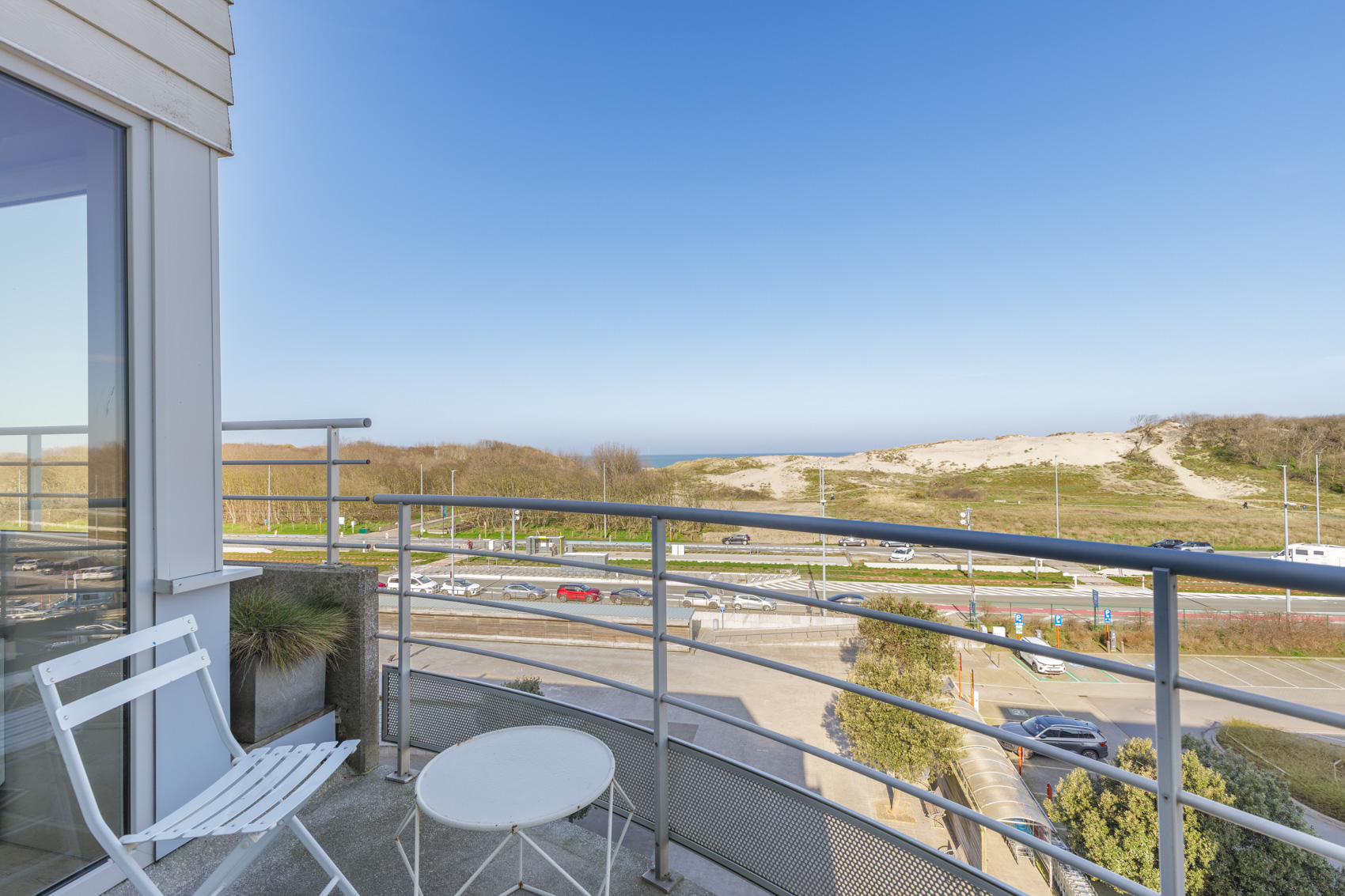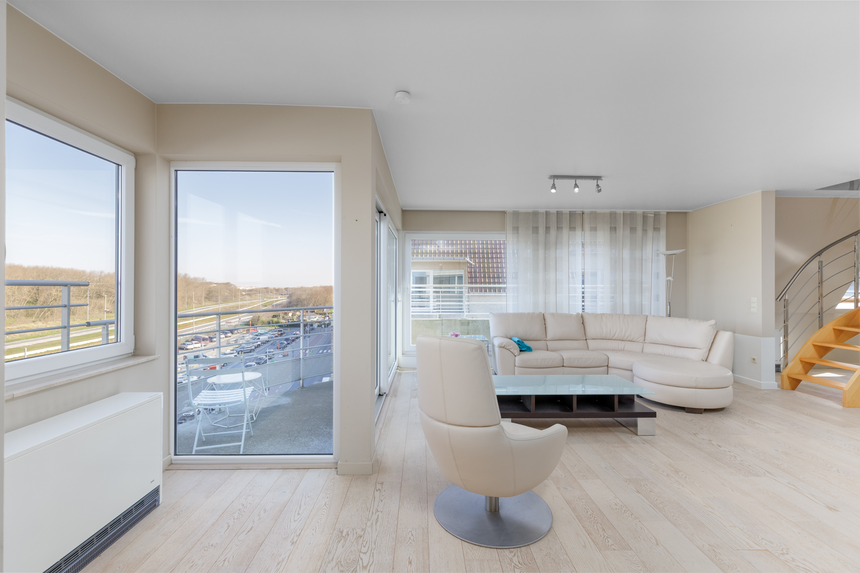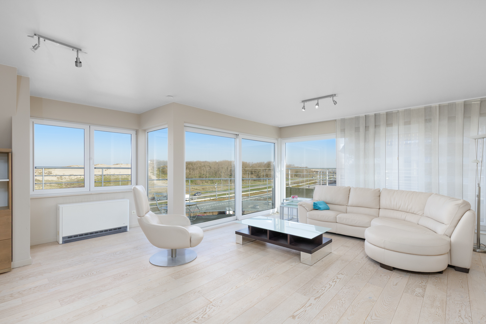 Dankzij de gunstige hoekligging en de brede leefruimte van maar liefst 7 meter geniet het appartement van een uitzonderlijke lichtinval en een prachtig panoramisch zicht op de duinengordel.