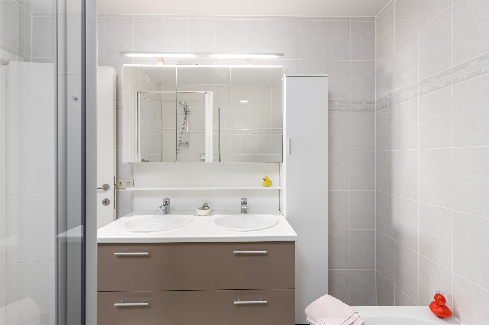 Bij het betreden van het appartement komt u in een ruime inkomhal met vestiaireruimte en een gastentoilet. De lichtrijke leefruimte is ingedeeld met aparte eetplaats en een gezellige zithoek met open keuken. Aansluitend aan de leefruimte bevindt zich een terras van ca. 8 m², waar u heerlijk kunt genieten van de omgeving.