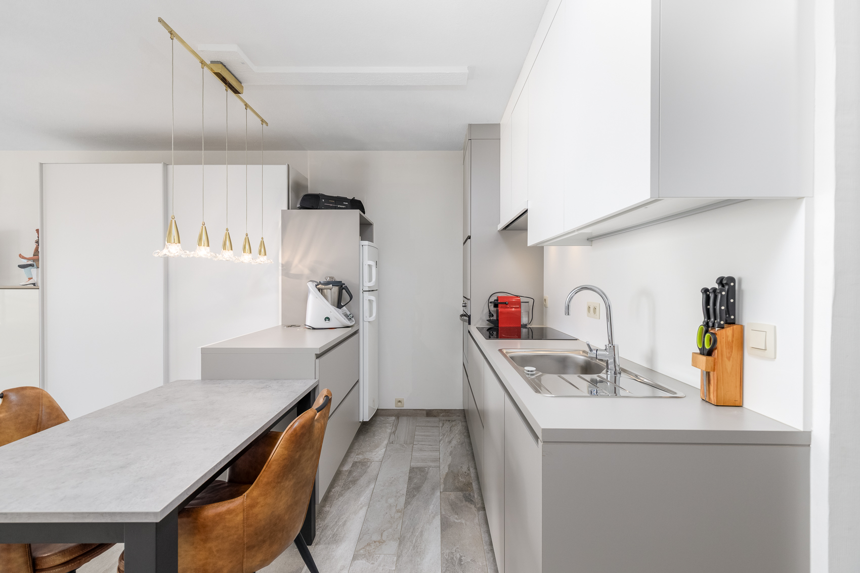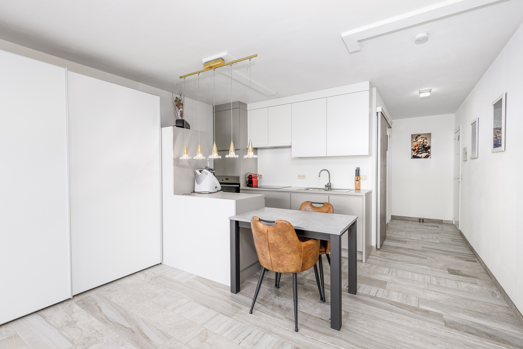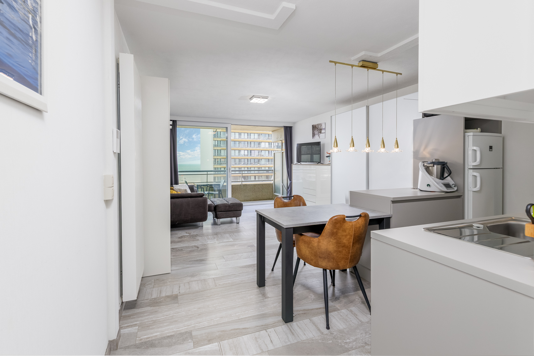 De studio is optimaal ingedeeld en beschikt over een lichtrijke leefruimte met directe toegang tot het terras, waar u elke dag geniet van een panoramisch zicht op zee. De moderne, volledig uitgeruste keuken is voorzien van kwalitatieve toestellen (Zanussi), waaronder een oven, microgolf, kookplaat, vaatwasser, koelkast en diepvriezer.
