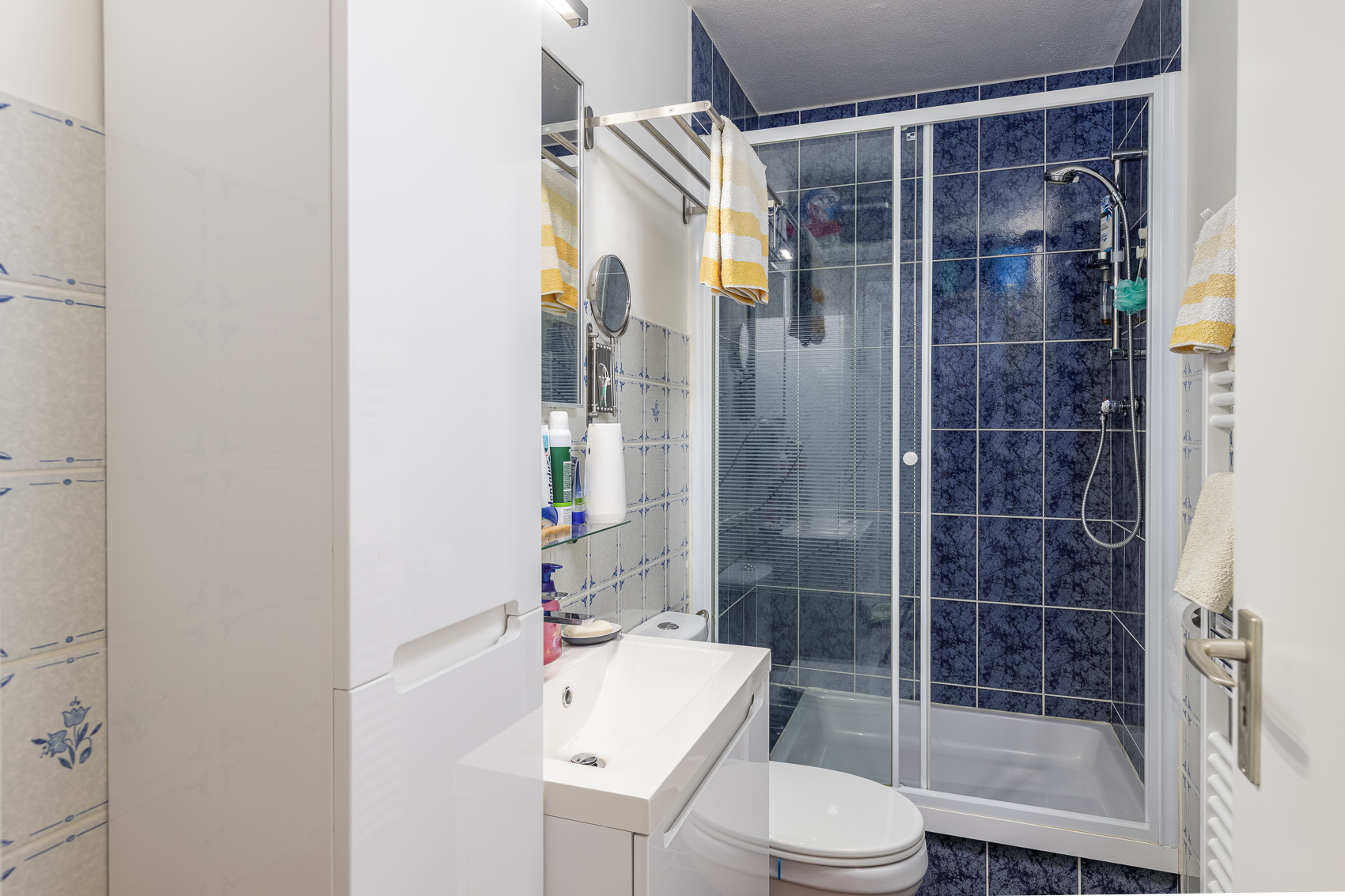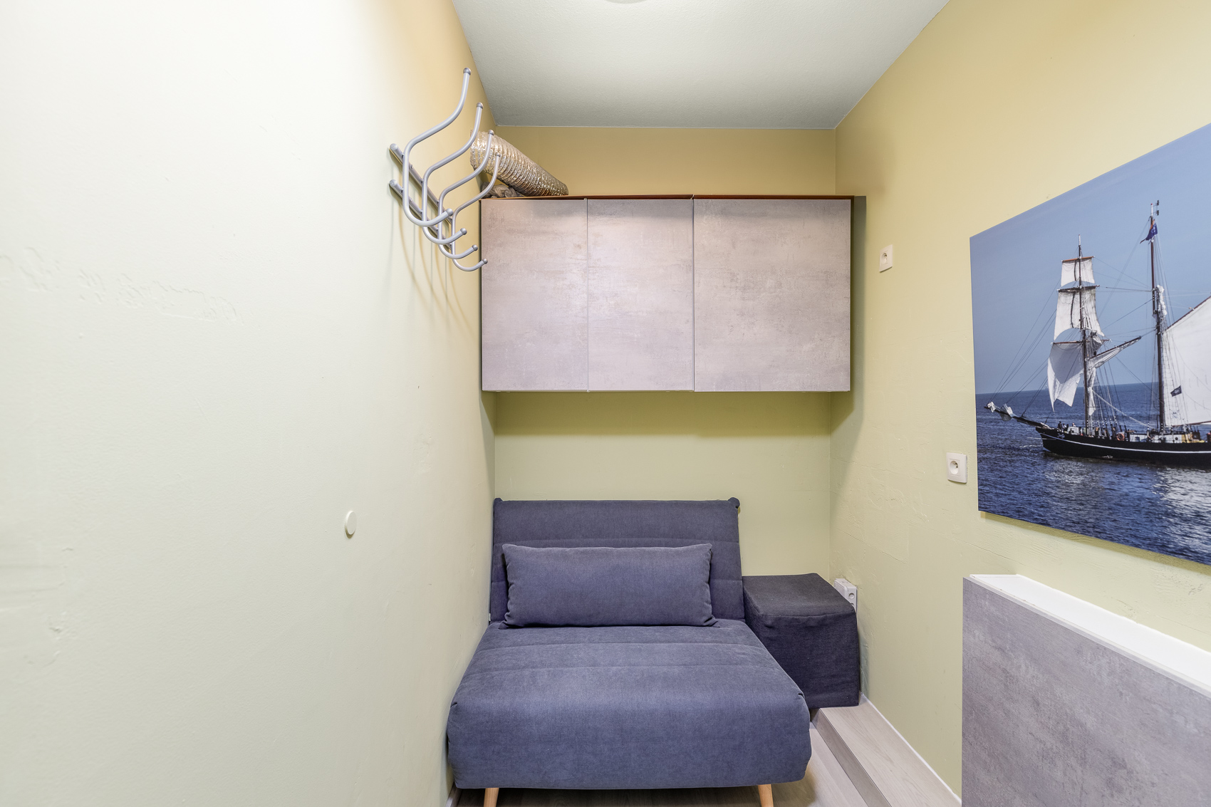 Daarnaast is er een praktische slaaphoek en een badkamer met lavabomeubel, douche en toilet. In de leefruimte zorgt een ingebouwde kast met uitklapbaar tweepersoonsbed voor extra comfort en ruimte-efficiëntie.