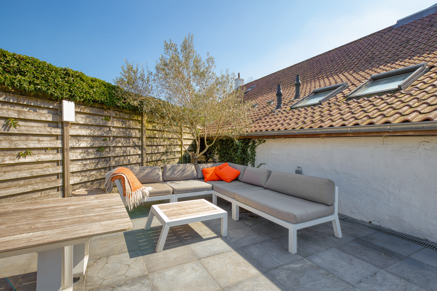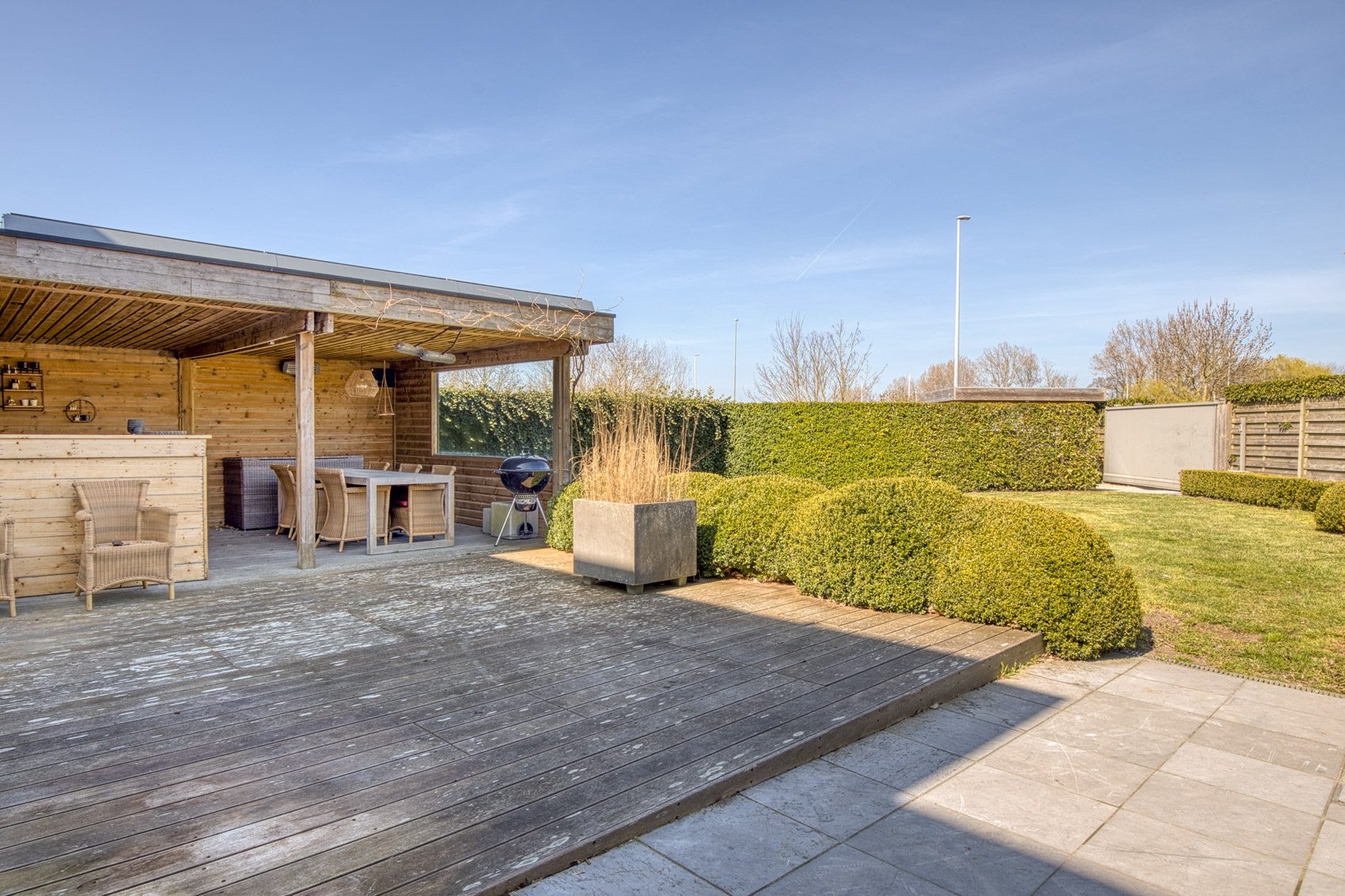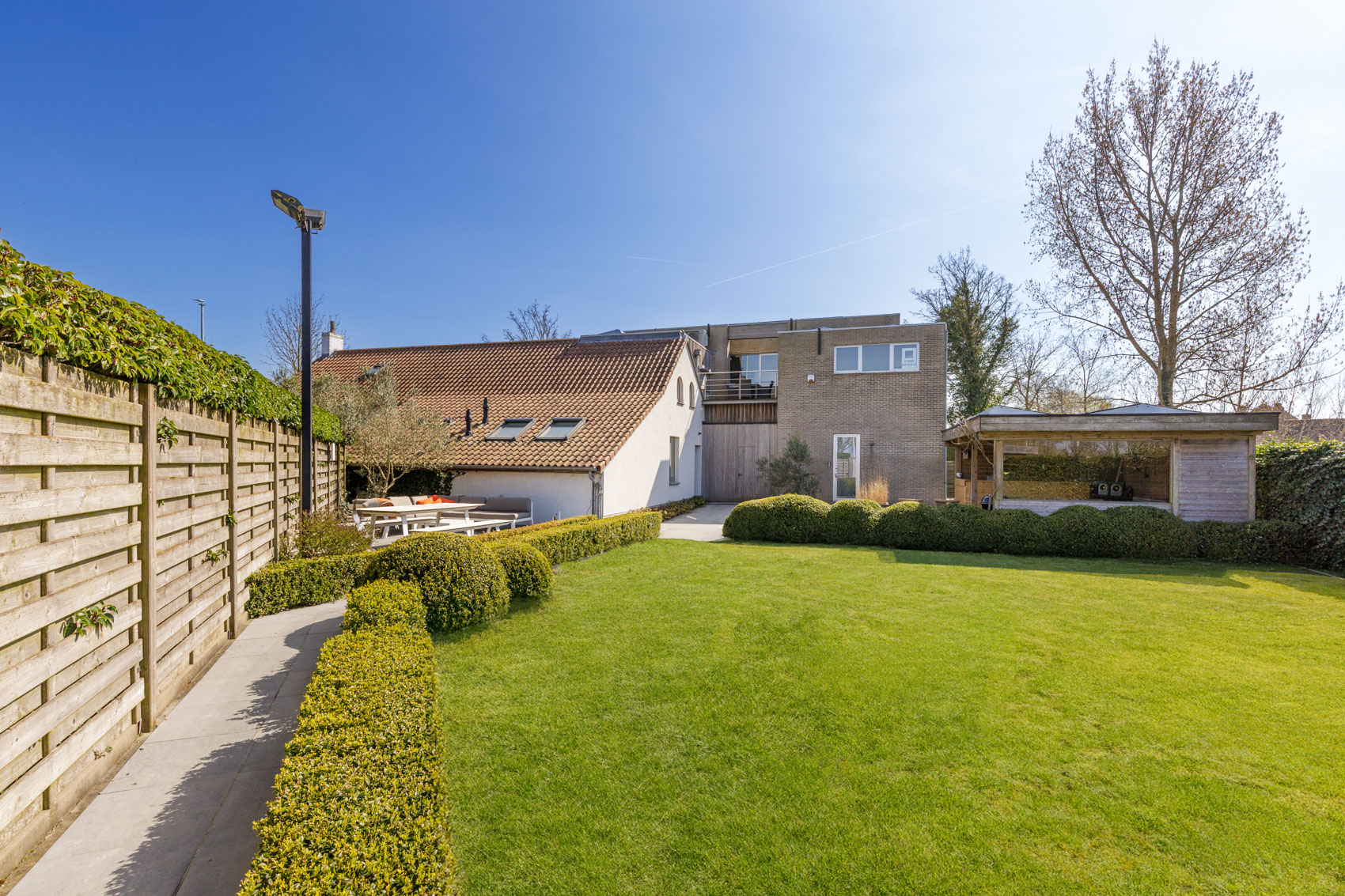 Aan het privégedeelte bevindt zich een prachtig aangelegde tuin met een zithoek en een overdekte zomerbar. Het volledig omheinde terrein is afgesloten met een automatische poort en biedt parkeergelegenheid en een tuinberging.