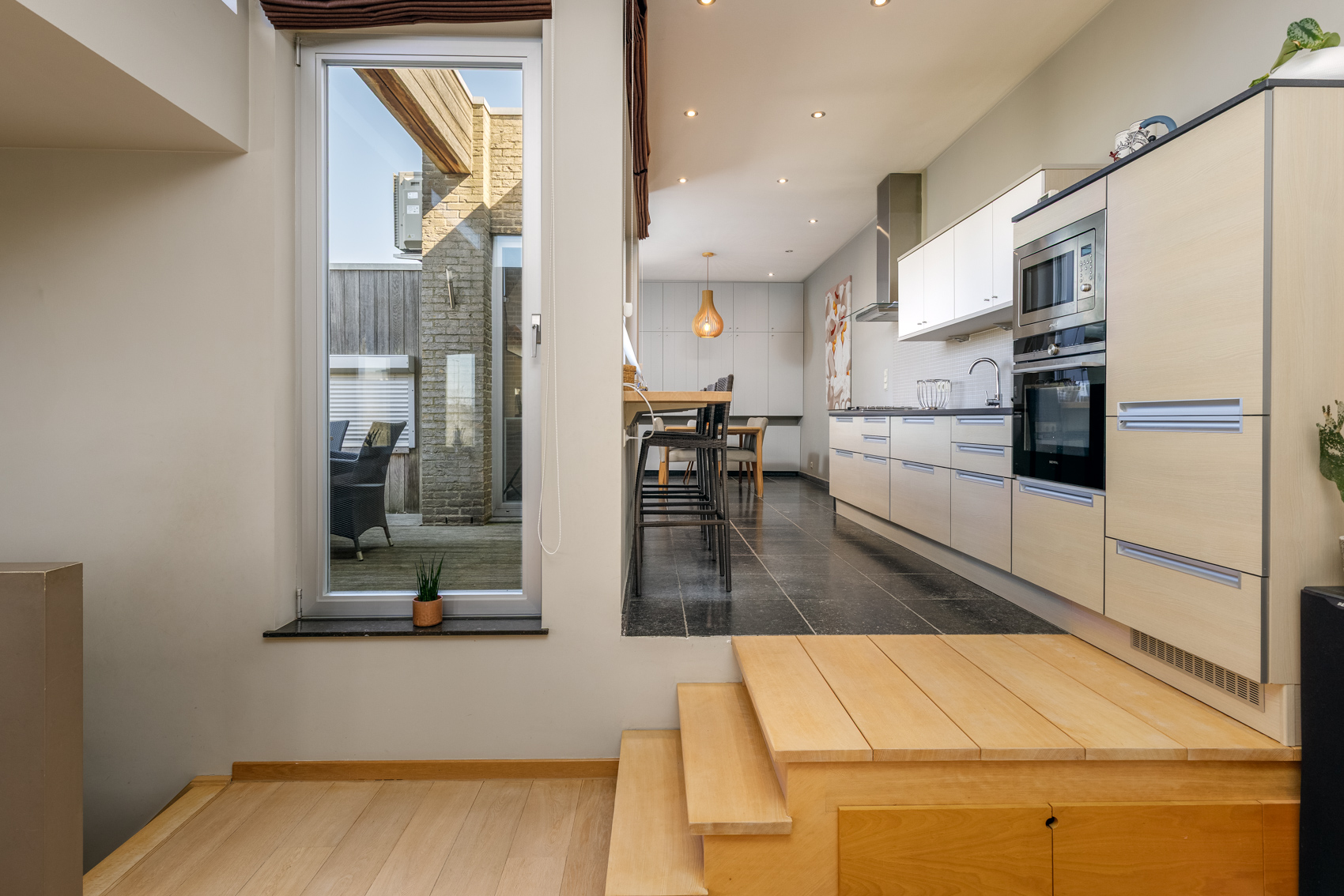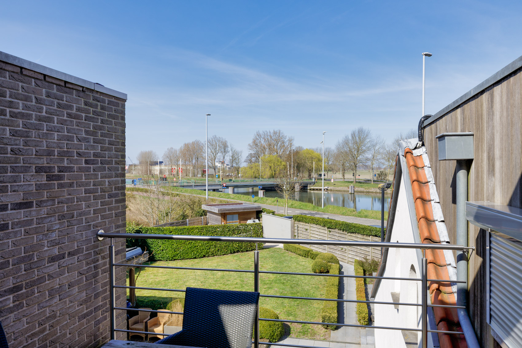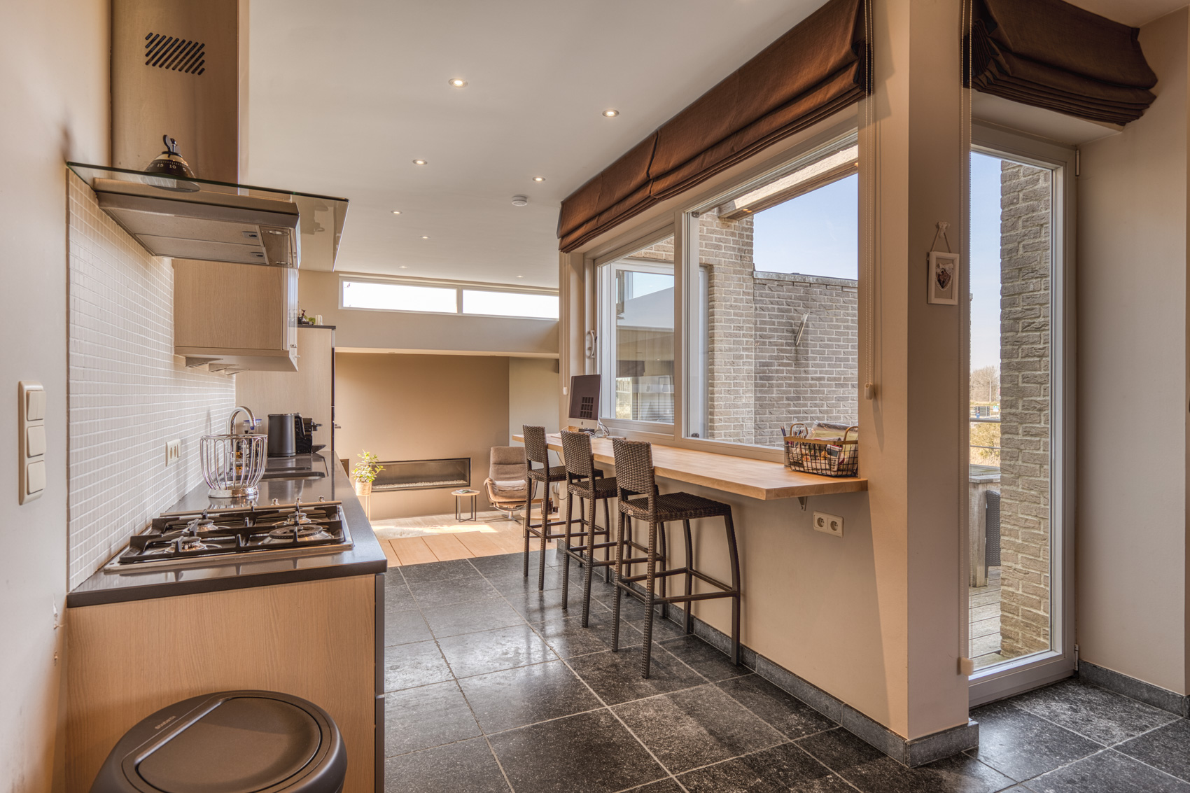 🔹 Volledig ingerichte keuken met privé-terras en zicht op de tuin en het kanaal